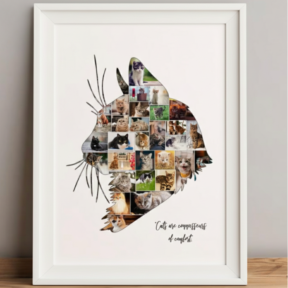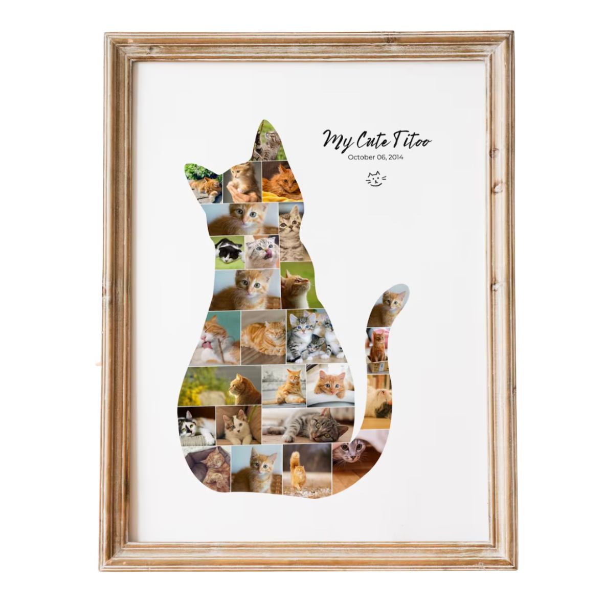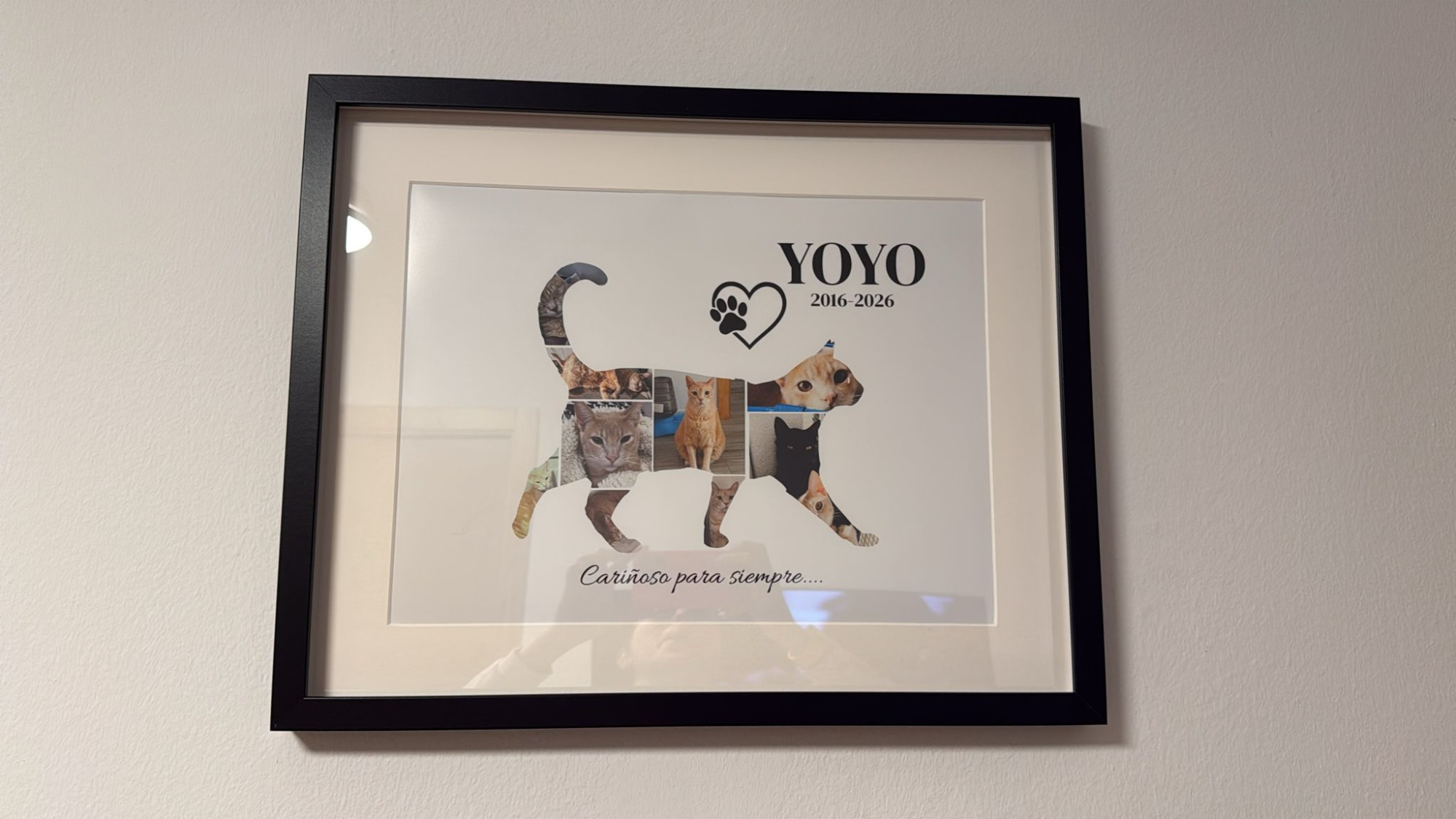 Un cuadro para recuerdo o cumpleaños con marco de color blanco, negro o madera, medidas 40x50 cm. Entre 10-20 fotografías de tu mascota podremos realizar el collage.